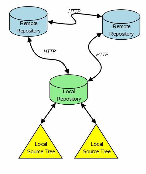 Communication between repositories is via HTTP. Remote repositories are identified by URL. You can also point a web browser at a repository and get human-readable status, history, and tracking information about the project.